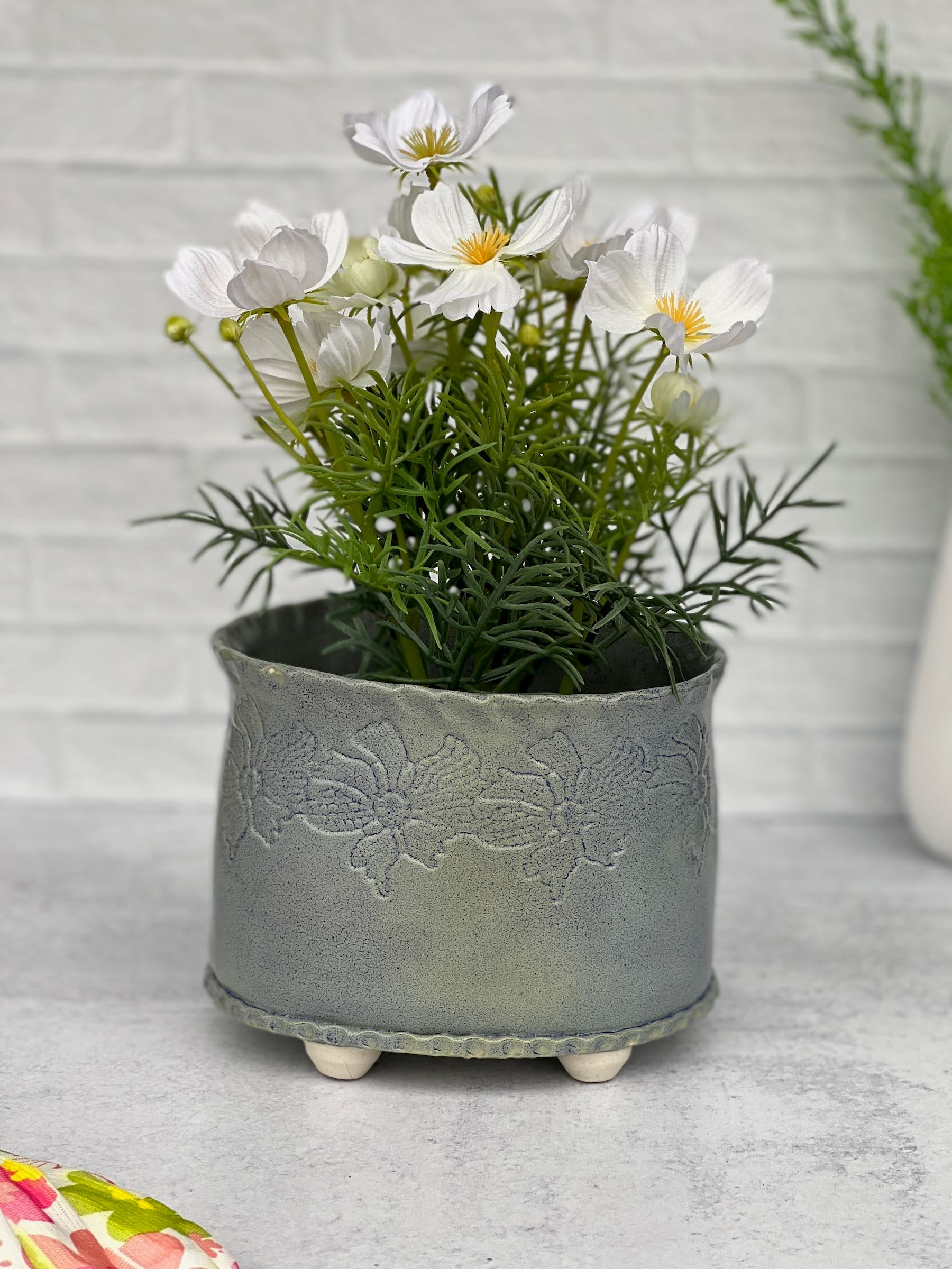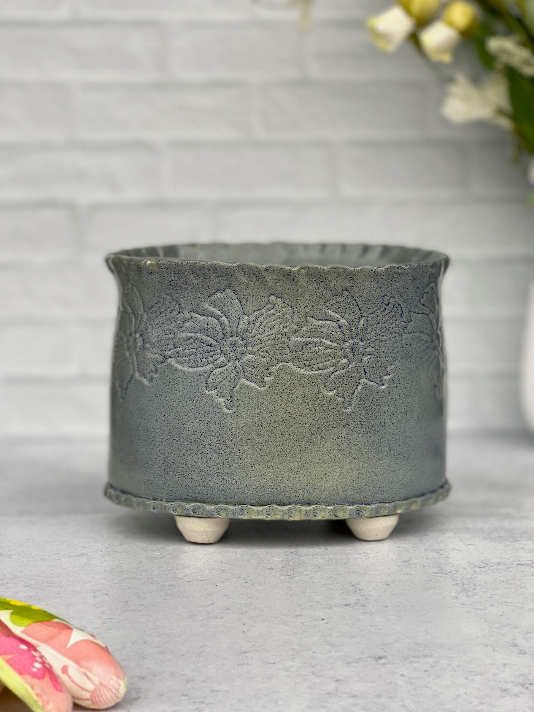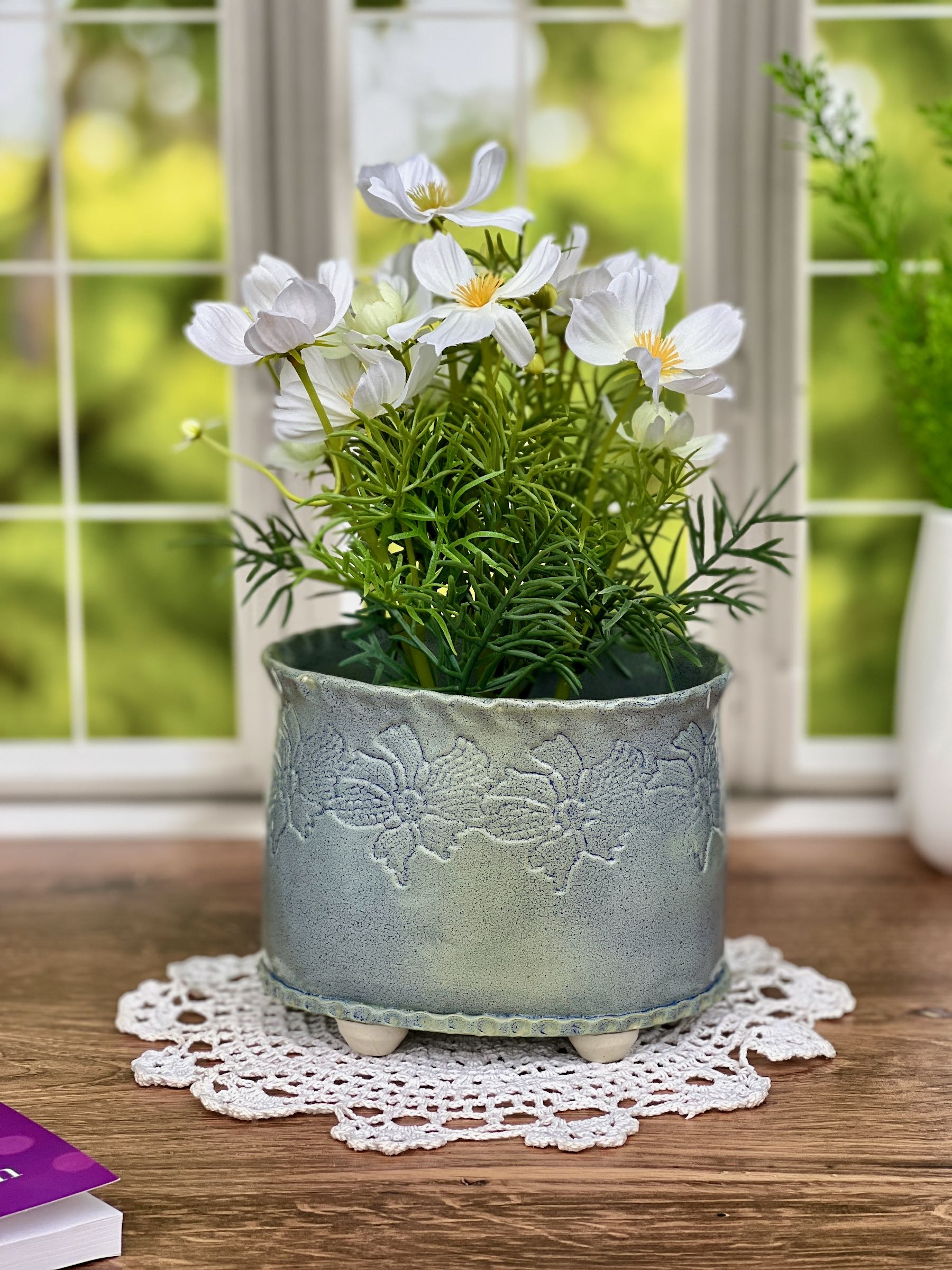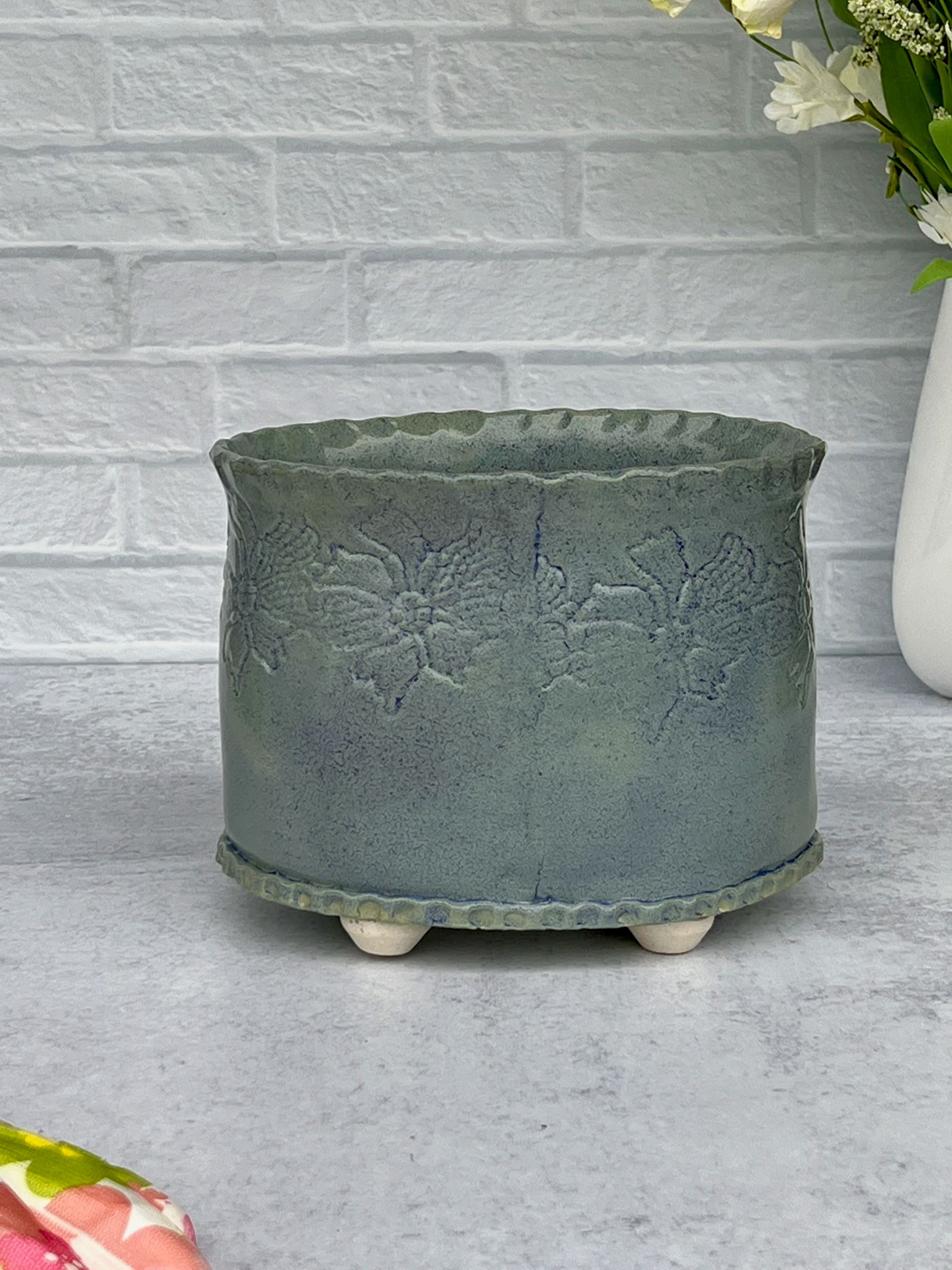 Introducing the Large Slab-built Oval Matte Blue Glazed Planter with Stamped Flower Design, a stunning addition to your home decor.
