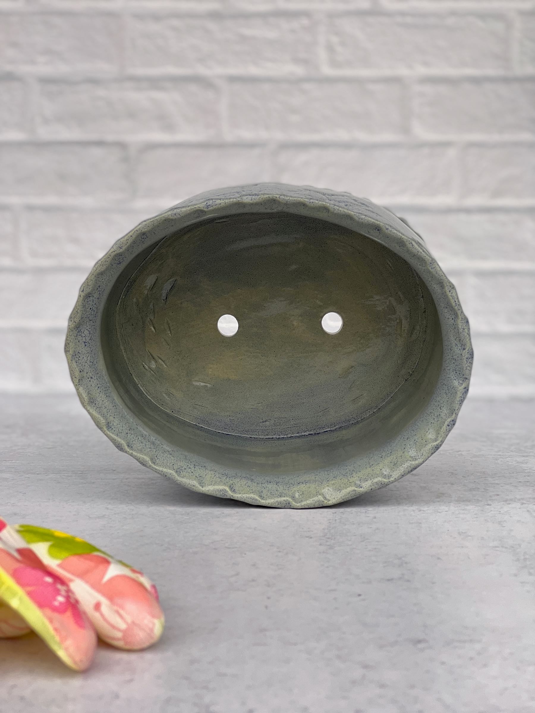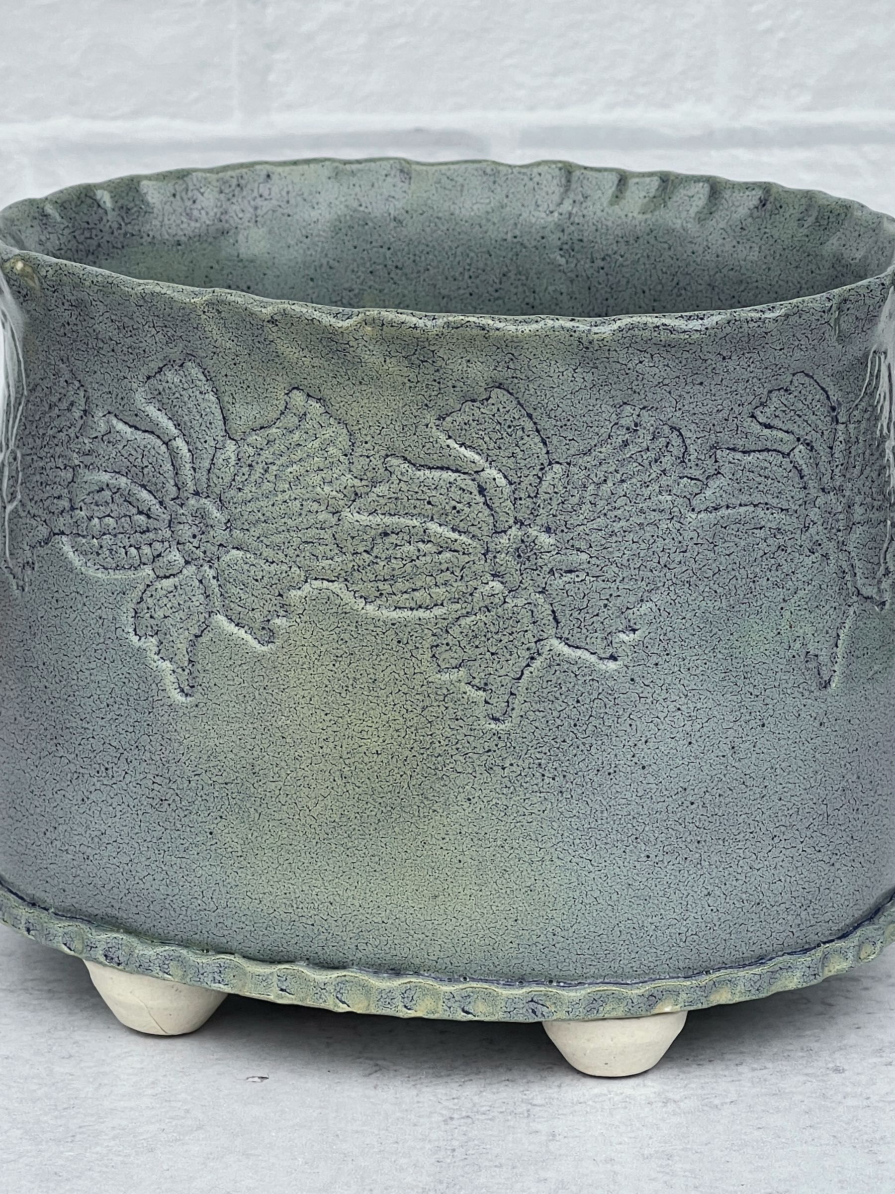 Large Slab-built Oval Matte Blue Glazed Planter With Stamped Flower Design