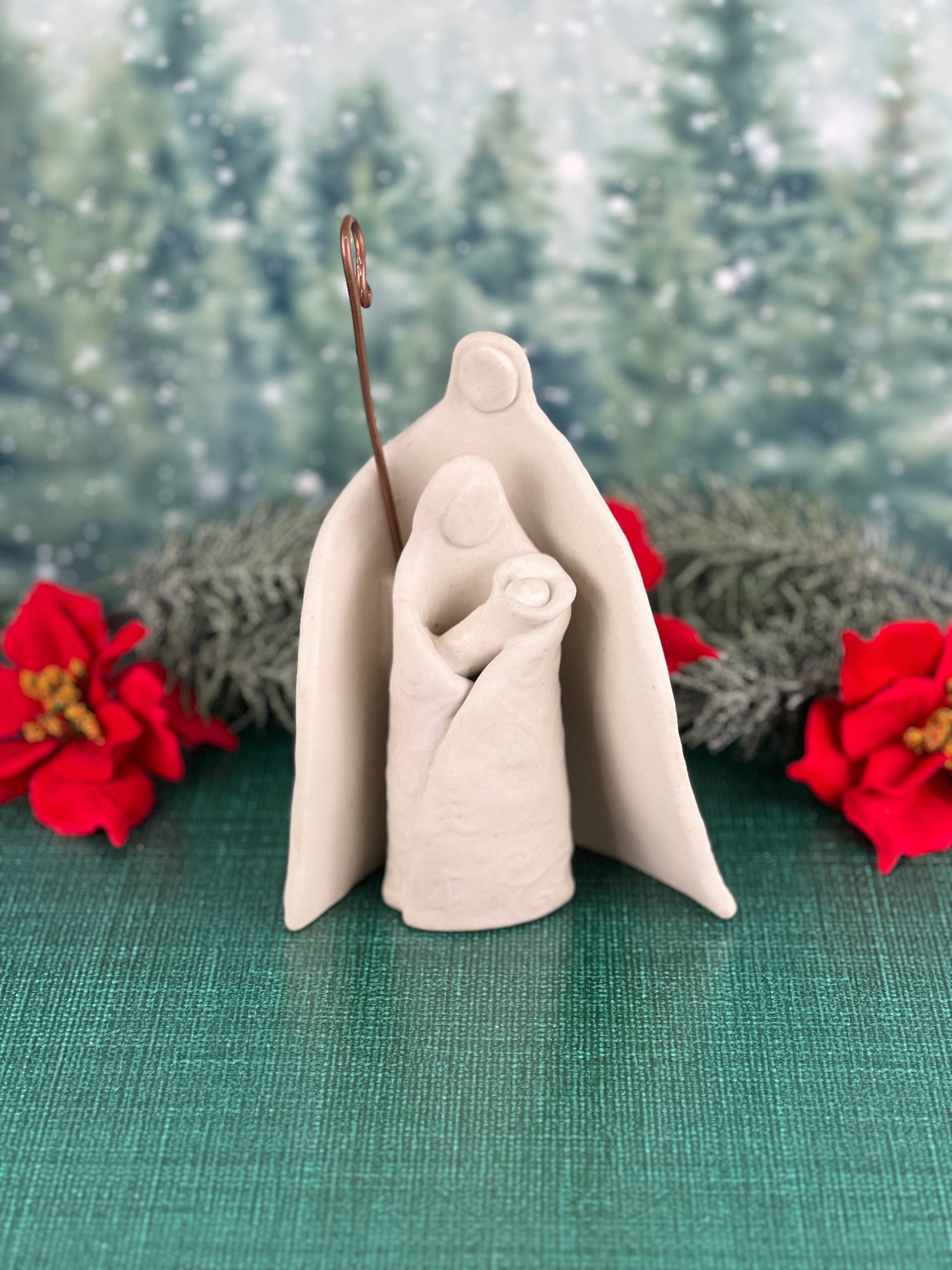Embrace the spirit of the season with our exquisite Nativity Holy Family Sculpture. Each piece is hand-built from premium porcelain clay, ensuring a unique and heartfelt representation of the holy family. Textured with a Christmas rolling pin, this artwork is not just a Nativity Scene but a stunning Christmas Decoration that adds an elegant touch to your holiday décor.