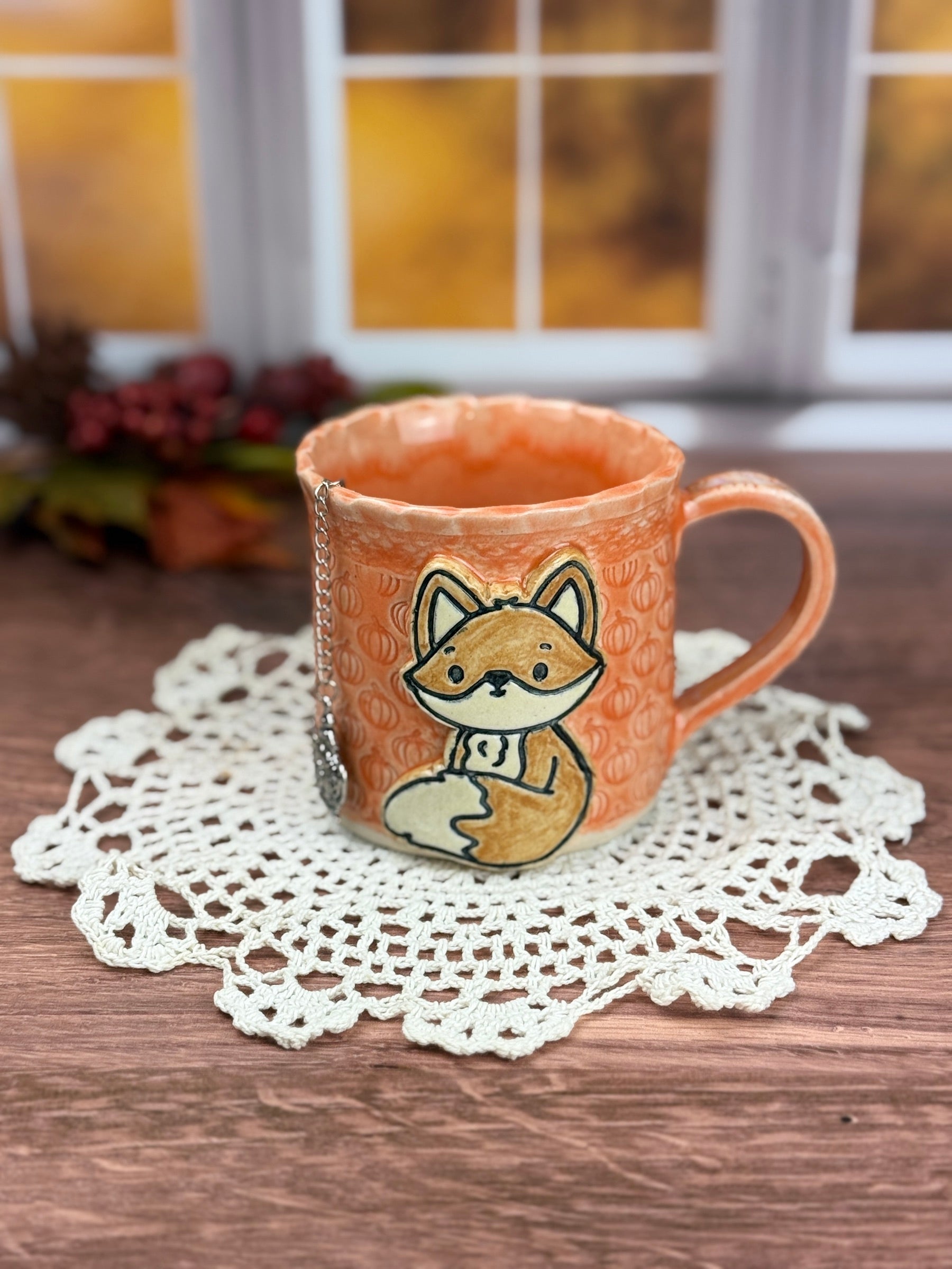 The Cozy mug was hand-built from a clay slab, rolled with a pumpkin texture roller, formed into a mug shape with an added handle. I then added a small fox cookie cutter design. After that, it was dried, bisque-fired, glazed with non-toxic glaze, and refired to 2232 degrees. It is then dishwasher safe and perfect for microwave use as the handle stays cool while the mug is filled with your favorite hot drink.