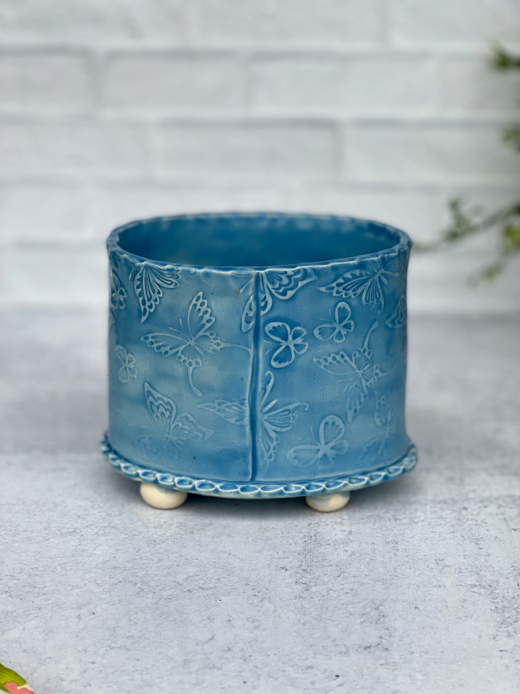 Enhance your space with the Oval Butterfly Textured Blue Planter. This exquisite ceramic planter features a delicate butterfly texture and a soft blue glaze, making it the perfect addition to any garden or indoor setting. Its small oval design is ideal for showcasing small flowers and greenery. Plus, with a convenient drain hole, you can ensure your plants thrive.