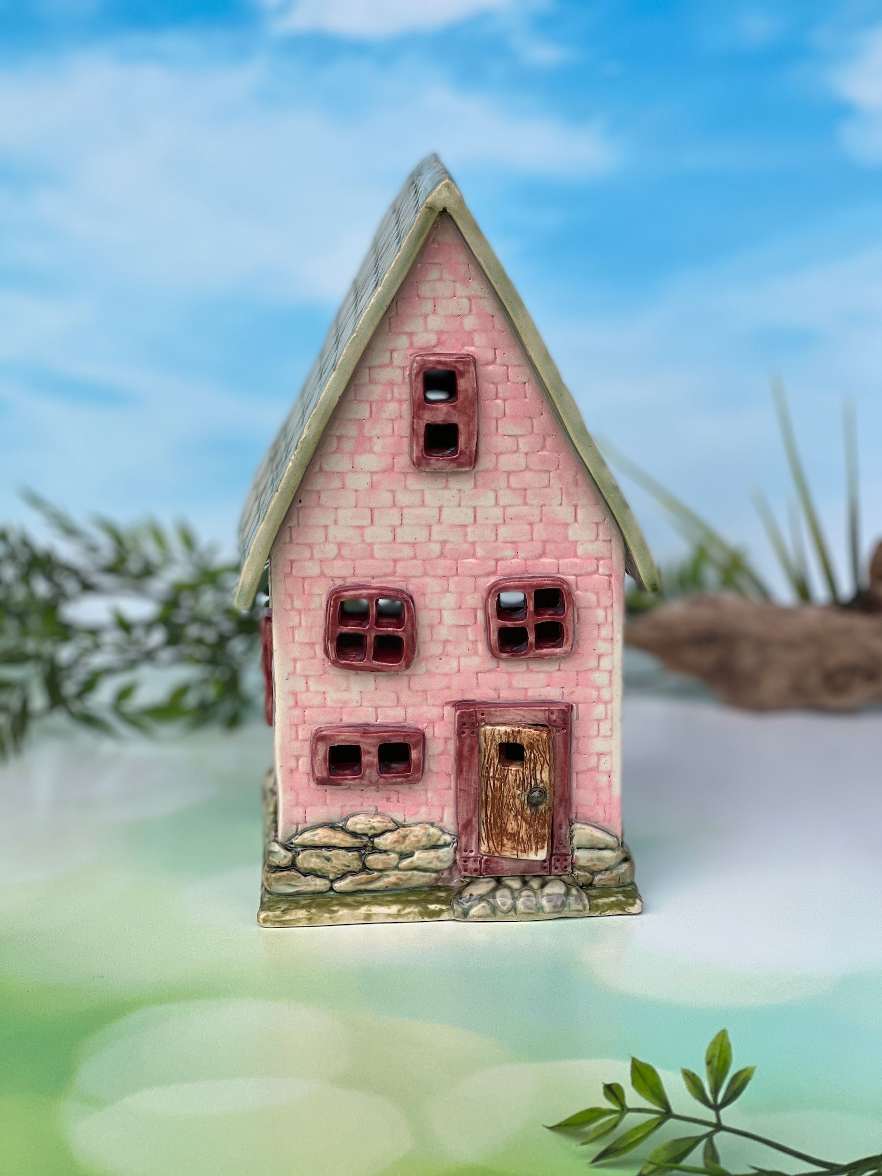 It measures 8" H x 4" L x 3 1/2" D and is hand-built with a slab of clay textured with a brick roller. Widows, a door, a rock foundation with added shrubs, and last but not least, a rock front step adorn this enchanting house. Glaze-fired to 2232 degrees, it is completely vitrified, making it ready to be outside in the elements.